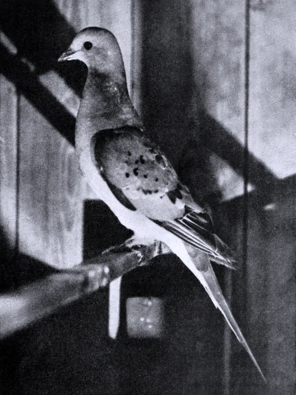 The passenger pigeon or wild pigeon (Ectopistes migratorius) is an extinct species of pigeon that was endemic to North America. Its common name is derived from the French word passager, meaning "passing by", due to the migratory habits of the species. The scientific name also refers to its migratory characteristics. The morphologically similar mourning dove (Zenaida macroura) was long thought to be its closest relative, and the two were at times confused, but genetic analysis has shown that the genus Patagioenas is more closely related to it than the Zenaida doves. The passenger pigeon was sexually dimorphic in size and coloration. The male was 390 to 410 mm (15.4 to 16.1 in) in length, mainly gray on the upperparts, lighter on the underparts, with iridescent bronze feathers on the neck, and black spots on the wings