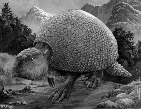 Glyptodon 'sculptured' and ὀδοντ-, ὀδούς (odont-, odoús) 'tooth') is a genus of glyptodont, an extinct group of large, herbivorous armadillos that lived from the Pliocene, around 3.2 million years ago, to the early Holocene, around 11,000 years ago, in South America