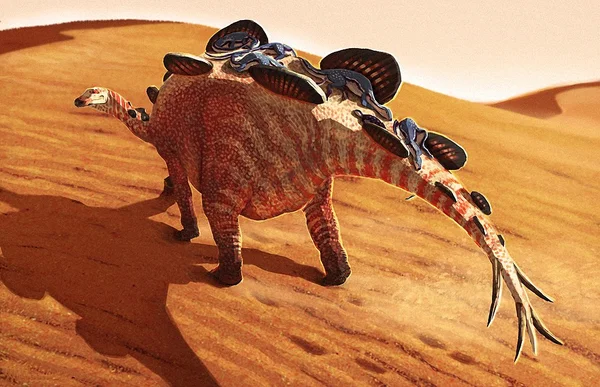 Hesperosaurus (from Ancient Greek ἕσπερος (hésperos), meaning "western", and σαῦρος (saûros), meaning "lizard") is a herbivorous stegosaurian dinosaur from the Kimmeridgian age of the Jurassic period, approximately 156 million years ago. Fossils of Hesperosaurus have been found in the state of Wyoming and Montana in the United States of America since 1985. The type species Hesperosaurus mjosi was named in 2001. It is from an older part of the Morrison Formation, and so a little older than other Morrison stegosaurs. Several relatively complete skeletons of Hesperosaurus are known. One specimen preserves the first known impression of the horn sheath of a stegosaurian back plate. Hesperosaurus was a member of the Stegosauridae, quadrupedal plant-eaters protected by vertical bony plates and spikes